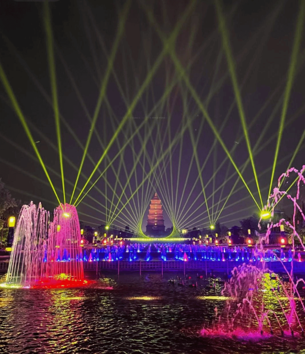 赴一场盛唐穿越之梦。音乐喷泉和灯光秀在黄昏时分启动,将大雁塔幻化为星空下的诗意画卷。