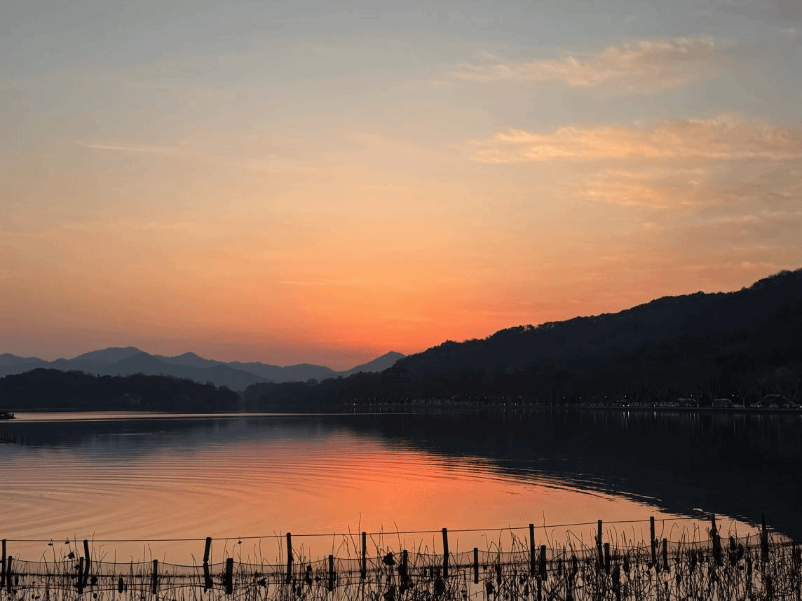 夕阳将西湖晕染成一片金橙交融的瑰丽色调。