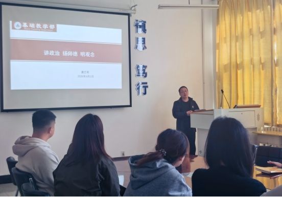 为深入落实立德树人根本任务,切实加强青年教师思想政治建设和师德师风培育,帮助青年教师扣好职业生涯“第一粒扣子”。2026年4月1日,基础教学部党总支书记唐艺军以“讲政治 扬师德 明观念”为主题,为部门青年教师带来了一场内涵深刻、贴合实际的专题讲座,引导青年教师坚定教育初心、恪守师德底线、树立正确育人观。